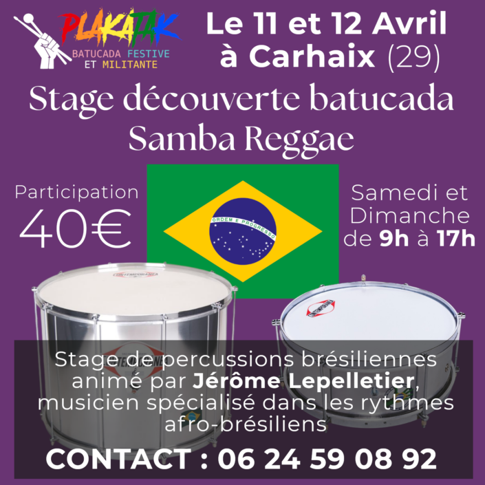 Stage de percussions brésiliennes animé par Jérôme Lepelletier les 11 et 12 Avril 2026 à Carhaix