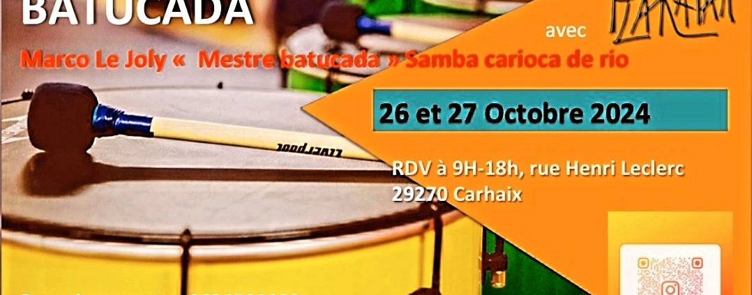 Stage débutants et confirmés de Batucada mené par Marco Le Joly, Mestre batucada Samba carioca de Rio.